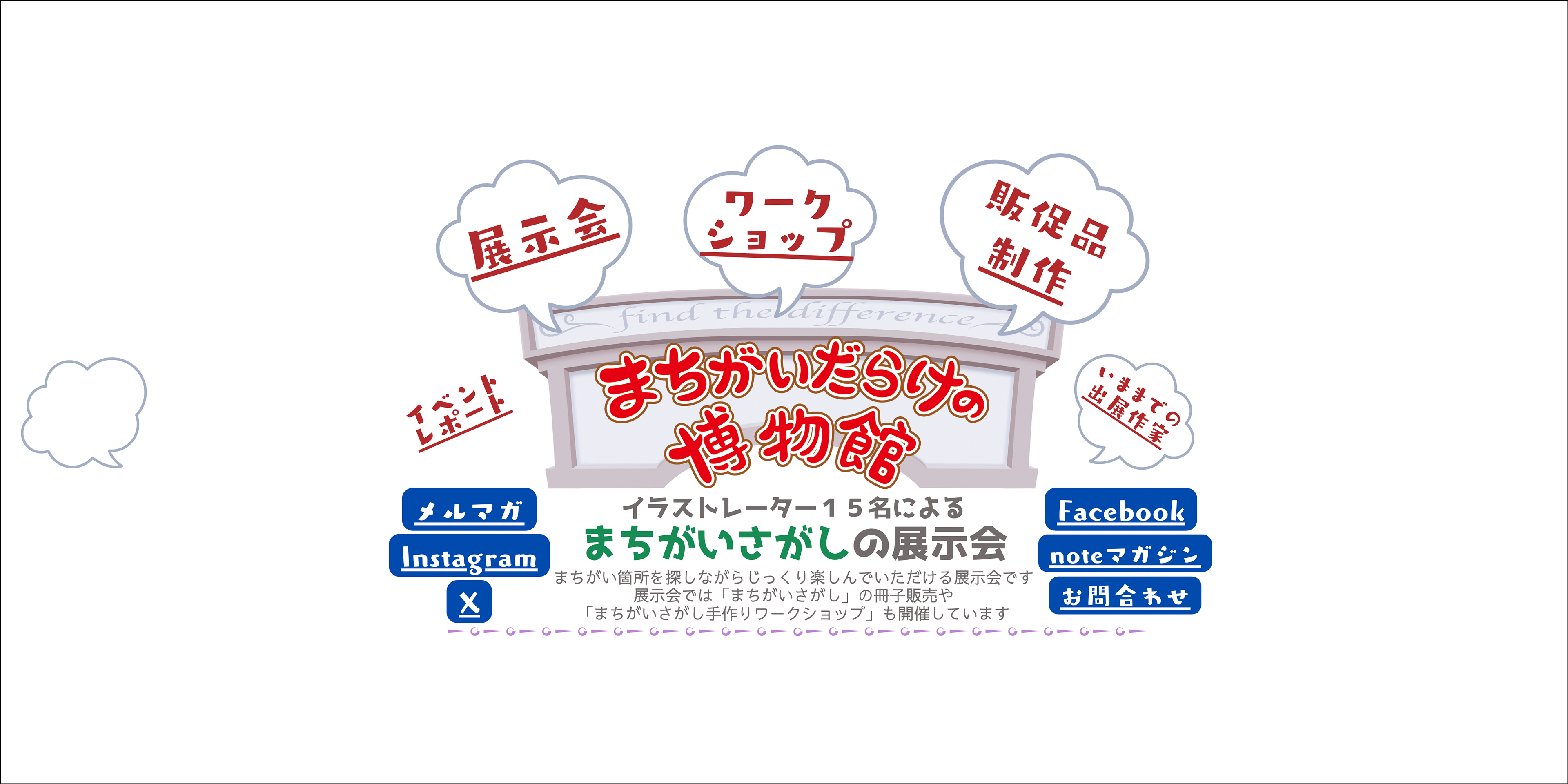 「間違い探し」をテーマにした、イラストレーターによるワークショップとグループ展のページです。